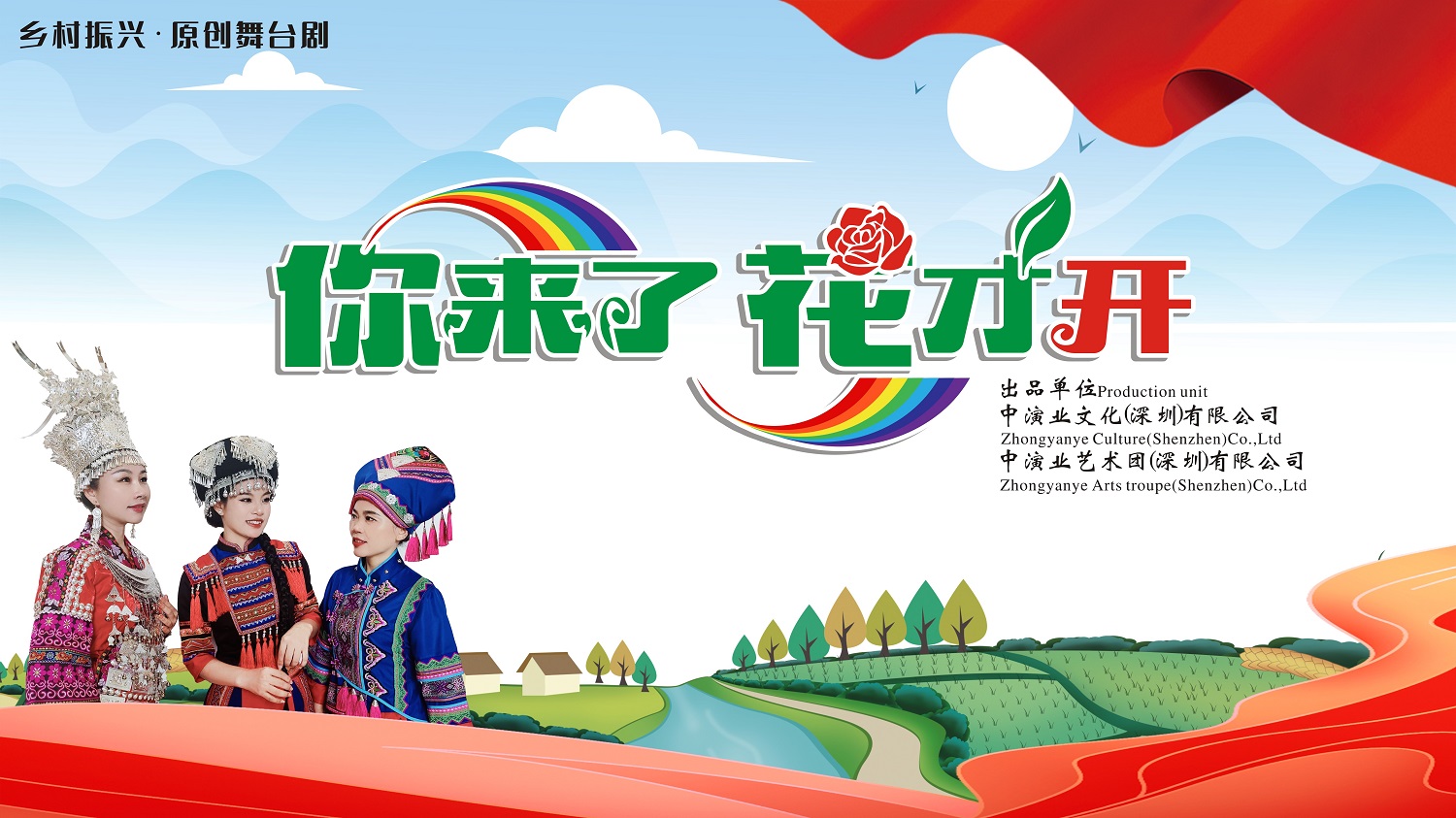 原创舞台剧《你来了花才开》将深圳龙岗帮扶百色那坡和靖西的实例事迹搬上舞台,以桂西南边陲“空壳村”为点, 帮扶干部扎根 “ 空壳村”,关爱留守儿童、妇女和老人 ,大力推出乡村振兴产业机制,通过 “对口帮扶” 引来了资金、 修通了公路、带来农业科技,发展乡村旅游,切实解决了一 大批关乎山乡群众切身利益的出行难、上学难、就医难、住 房难等问题,瑶寨彻底脱了贫摘了帽。 出去打工的 “候鸟” 们纷纷回到了家乡发展,“空壳村”变成了 “ 闹市村”,瑶寨村民过上了幸福美满的生活。